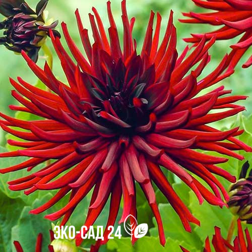 Георгина Нуит д’Эте — шикарный темно-бордовый кактусовидный сорт с черным отливом в сердцевине. Соцветия махровые, достигают диаметра 15 см, образованы скрученными в трубочки лепестками. Бутоны многочисленные, цветение длительное — с июля по октябрь, до первых ночных похолоданий. Рослые ветвистые кусты поднимаются на высоту до 1 метра и великолепно смотря как в одиночных акцентных, так и в групповых посадках.